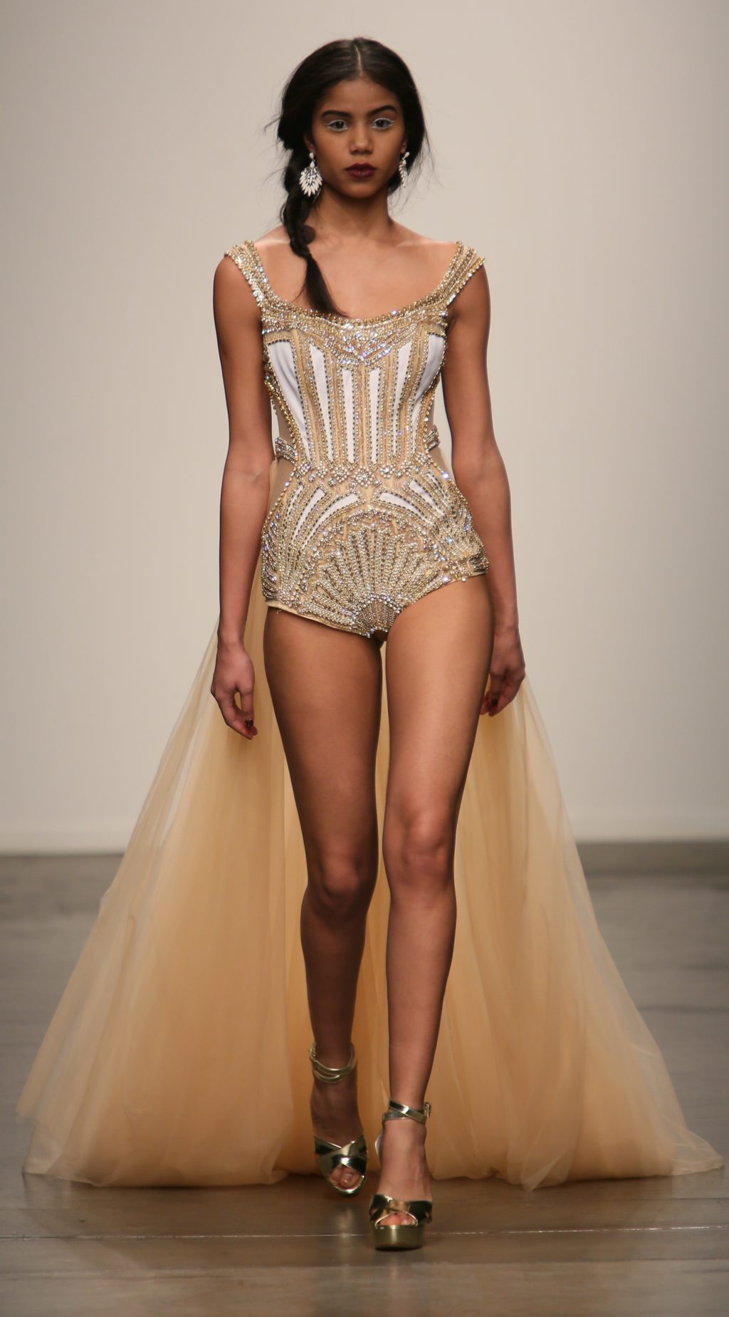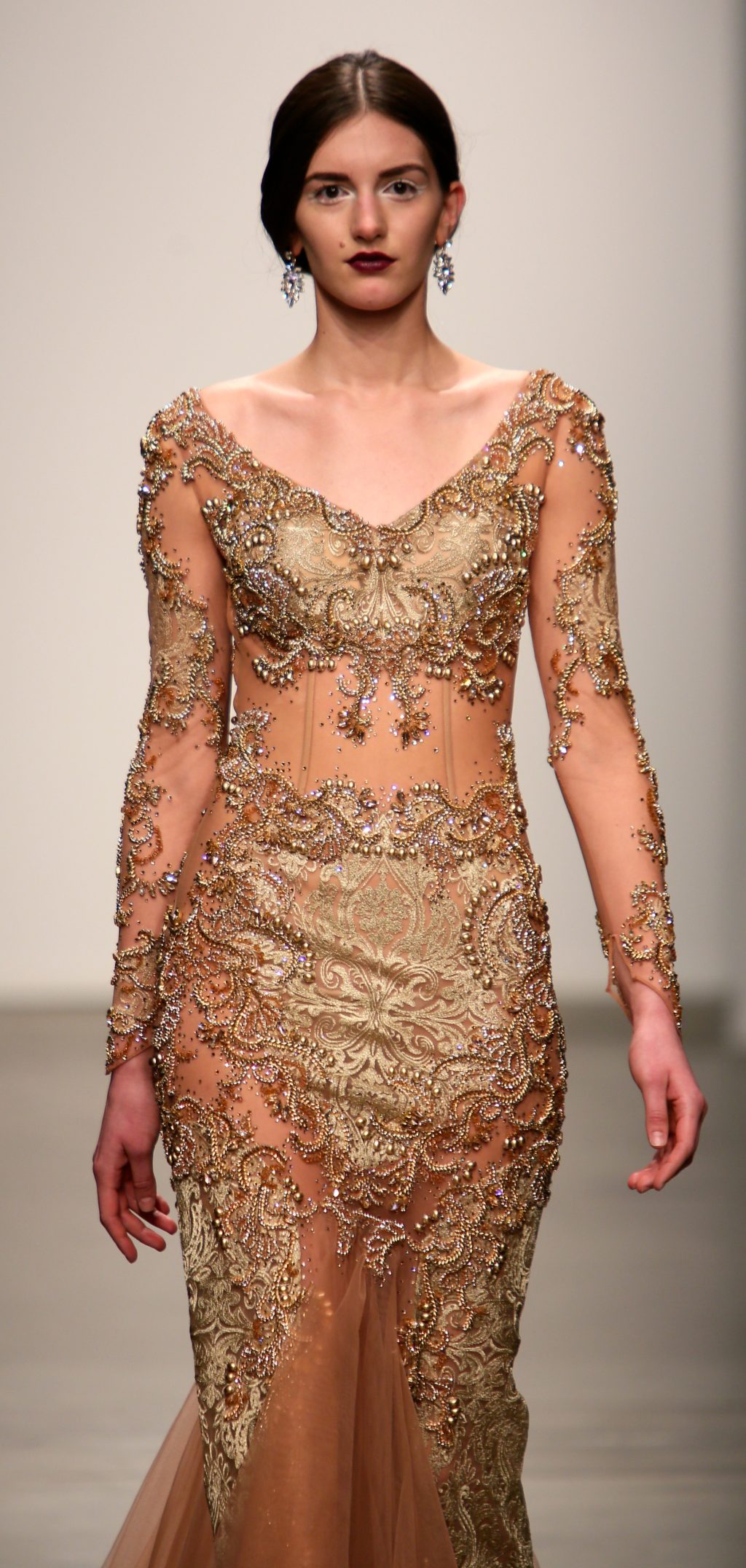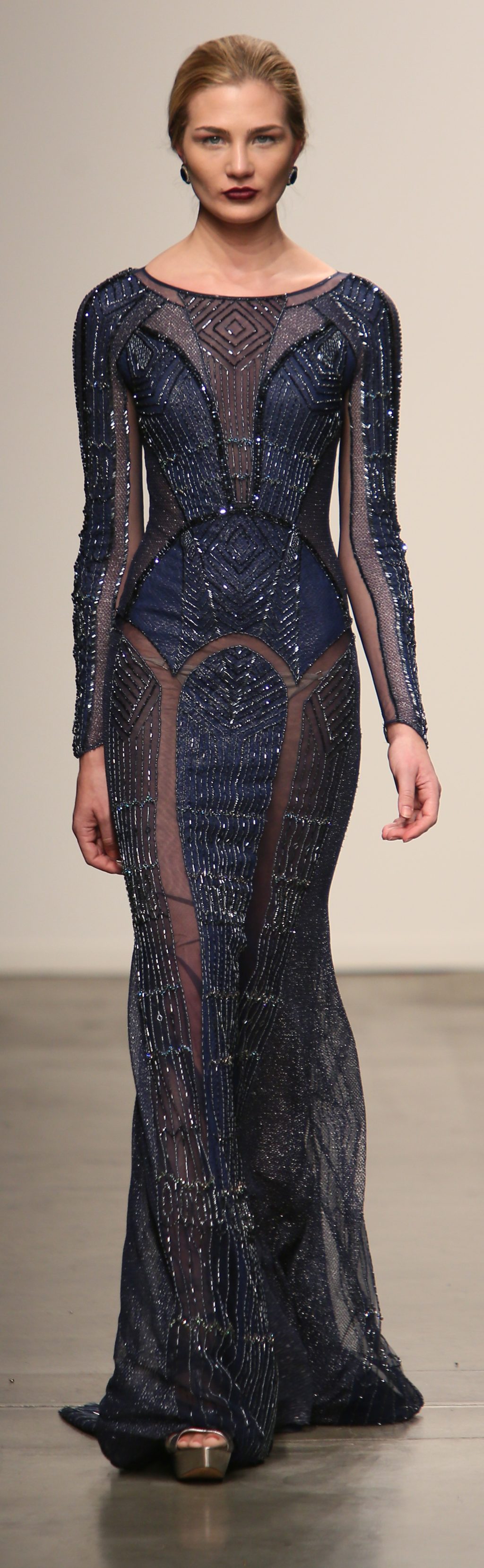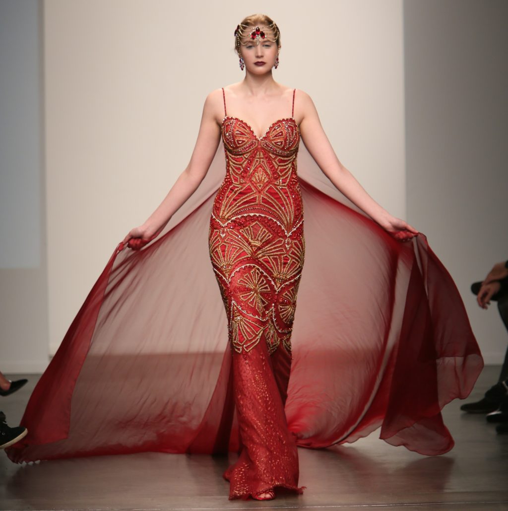 Strutting his vision for the 3rd time with Nolcha, Dany Tabet showcased the “Crystal Warrior.” The Lebanese designer begun his show by talking to his audience to deliver a message.
