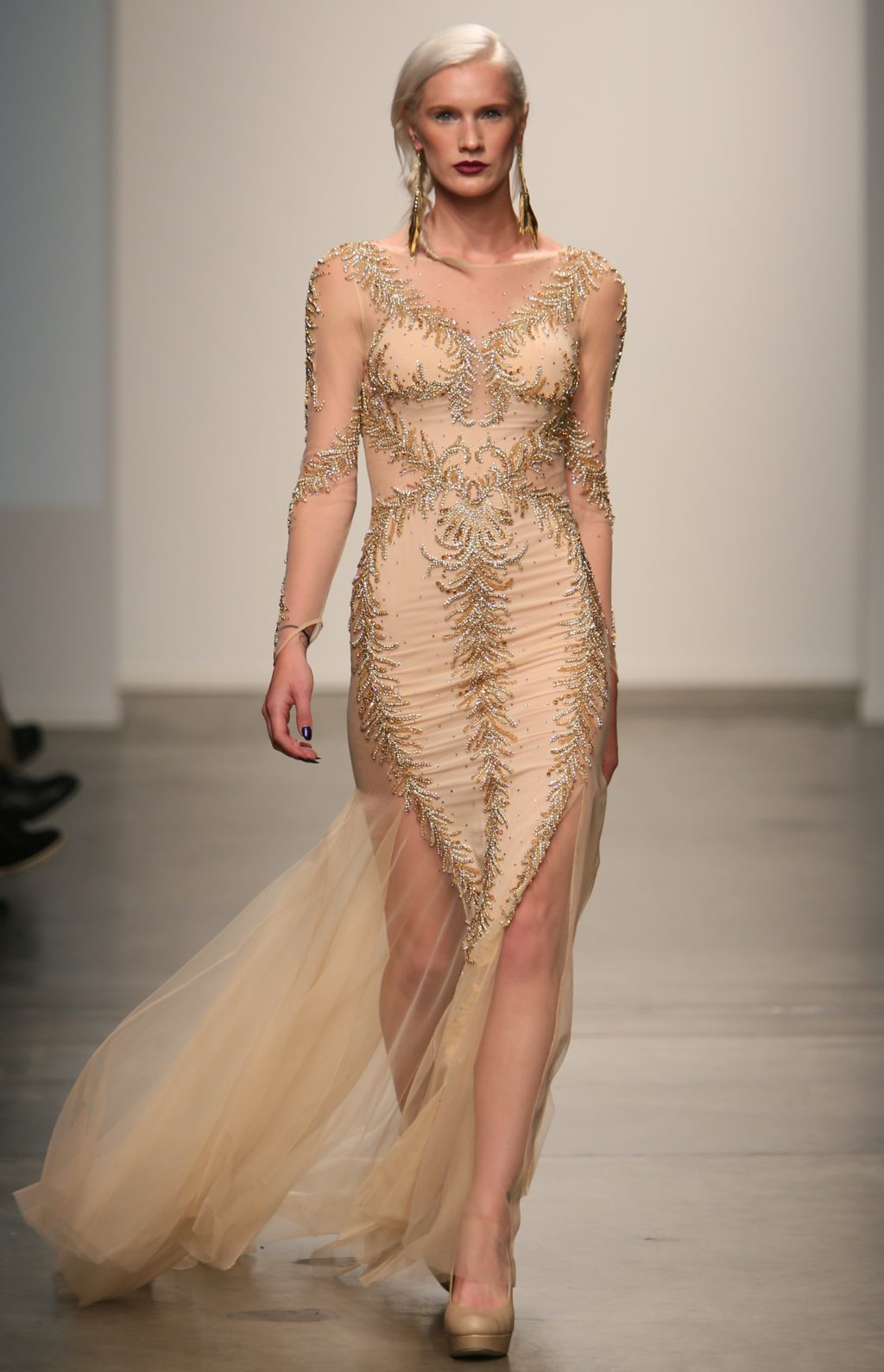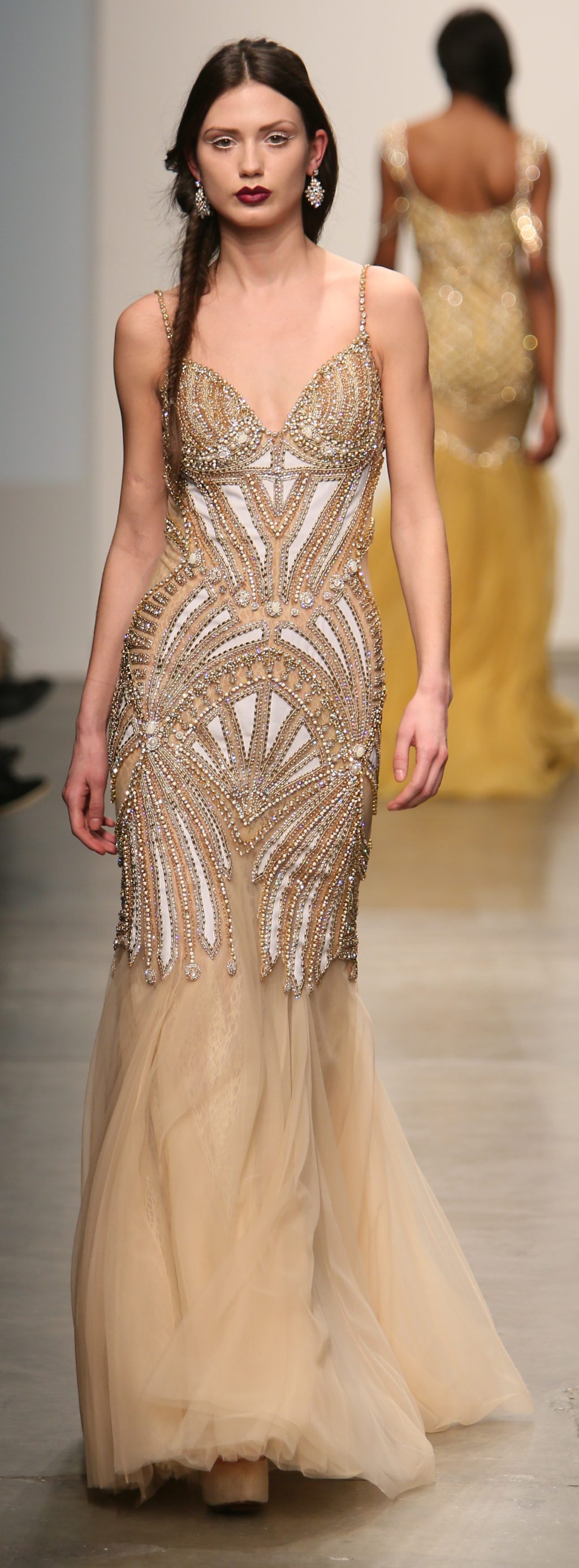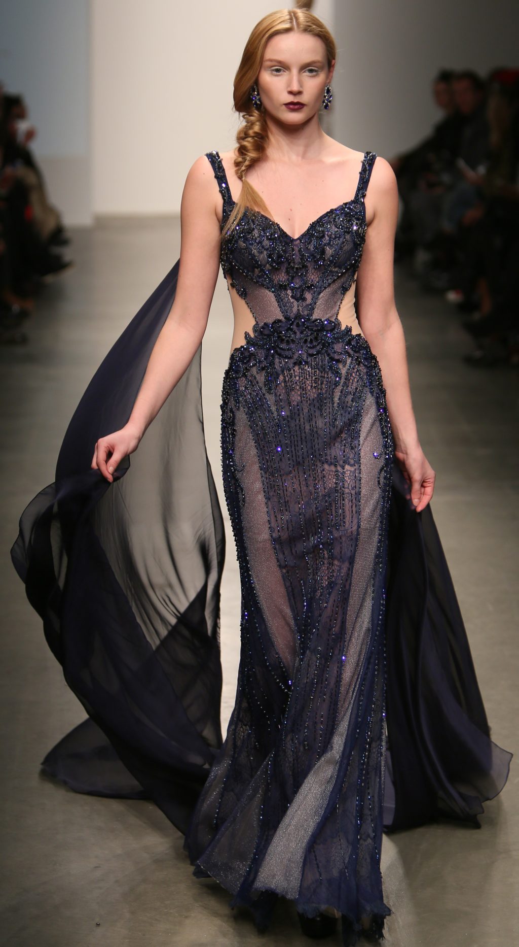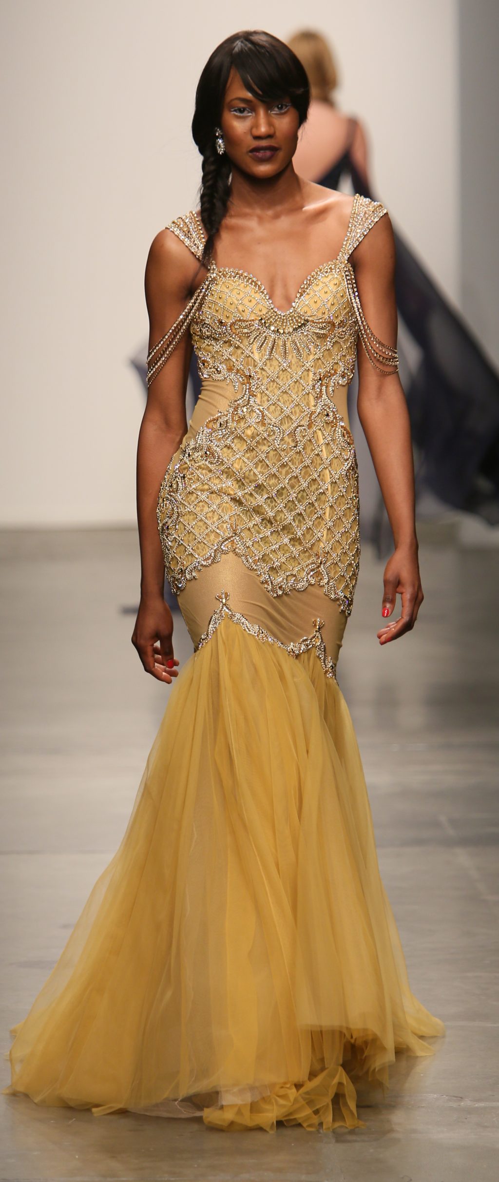 Strutting his vision for the 3rd time with Nolcha, Dany Tabet showcased the “Crystal Warrior.” The Lebanese designer begun his show by talking to his audience to deliver a message.