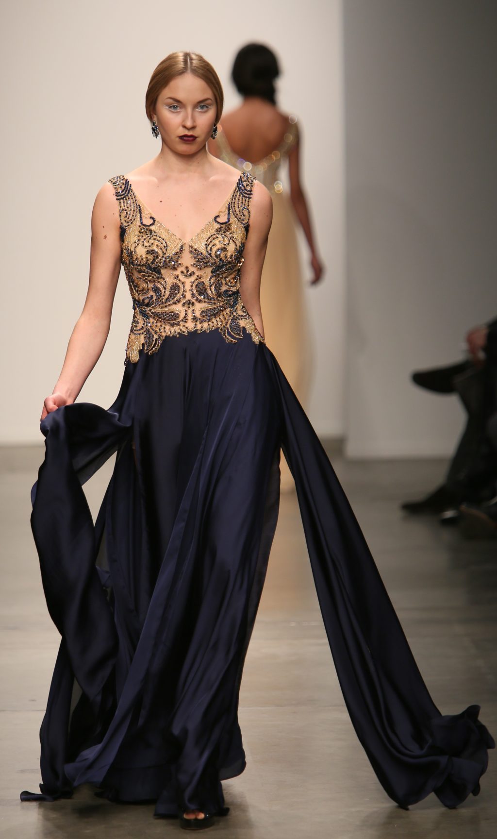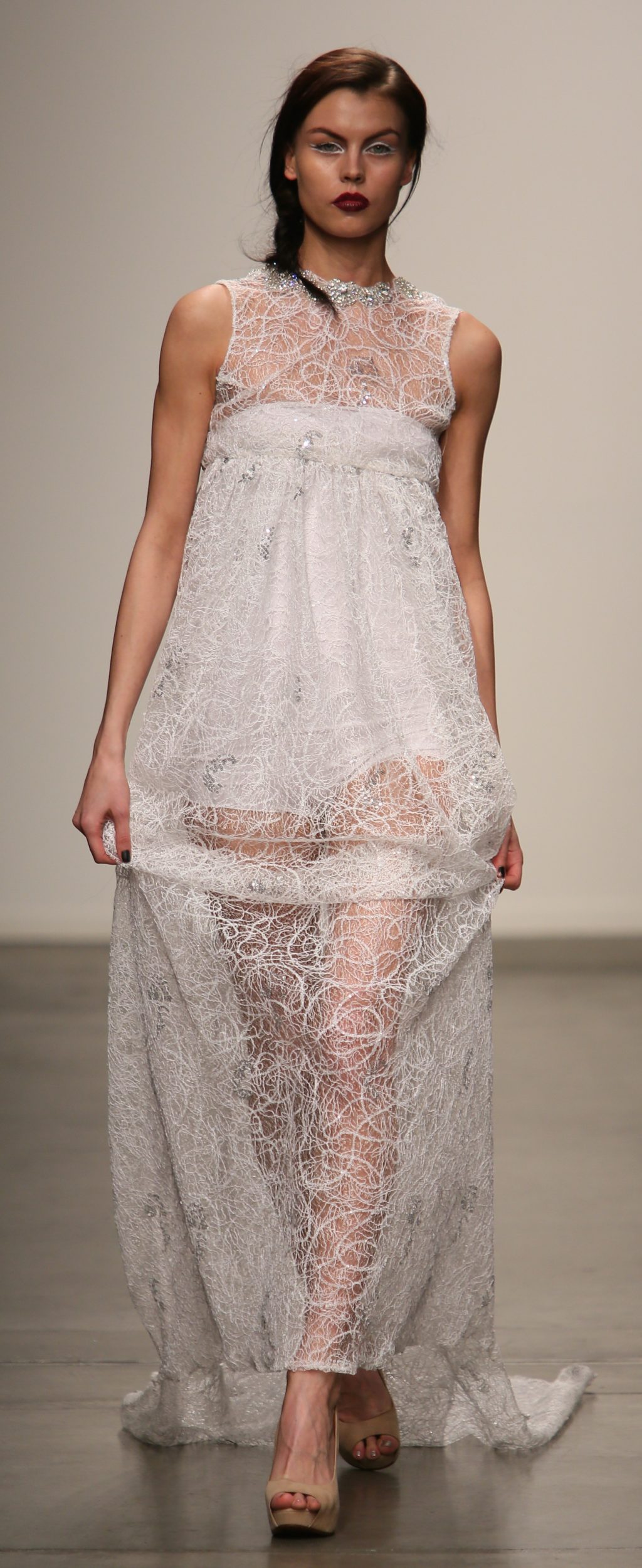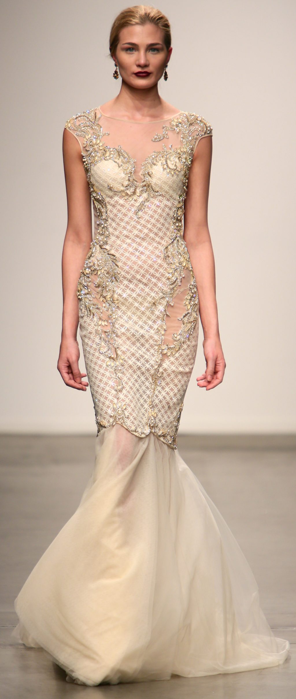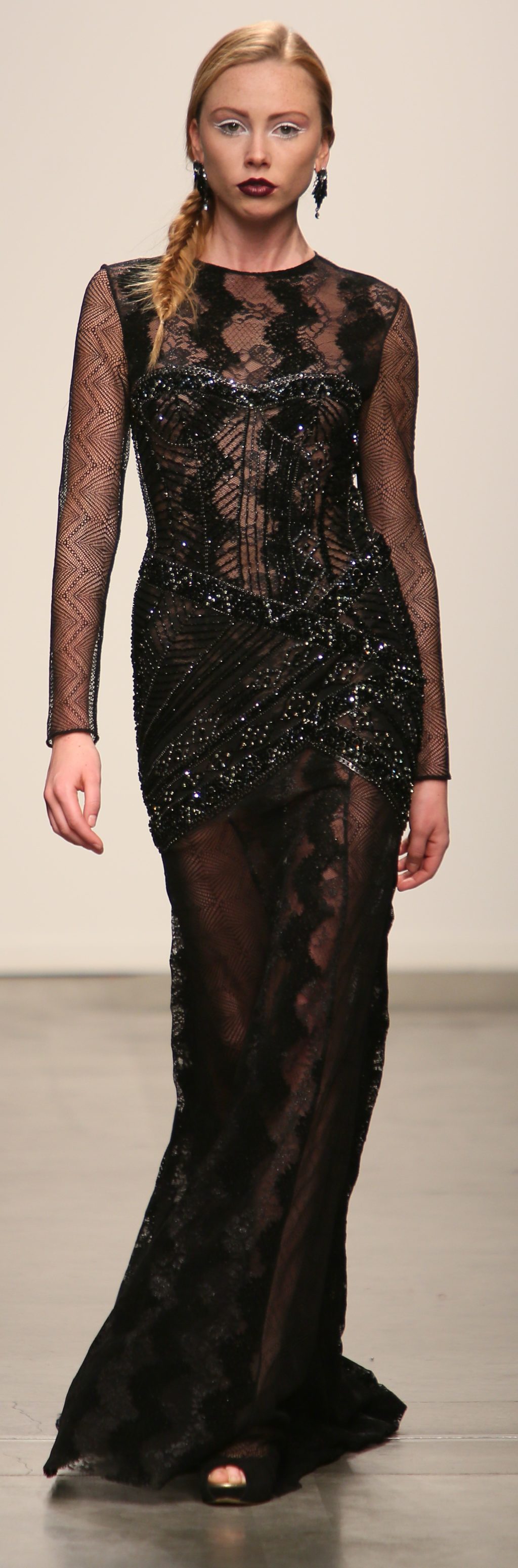 Strutting his vision for the 3rd time with Nolcha, Dany Tabet showcased the “Crystal Warrior.” The Lebanese designer begun his show by talking to his audience to deliver a message.
