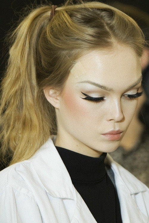 Go bold with color(s) by swiping your lid with nude shadow, do a swipe of bright liner on upper lashes, thickening at the end, swooping up towards brow. Finish off with a gunmetal or silver line on the bottom.